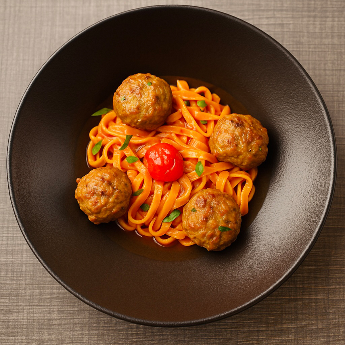 Boulettes de bœuf fait maison assaisonnées, tagliatelles fraîches sauce tomate maison