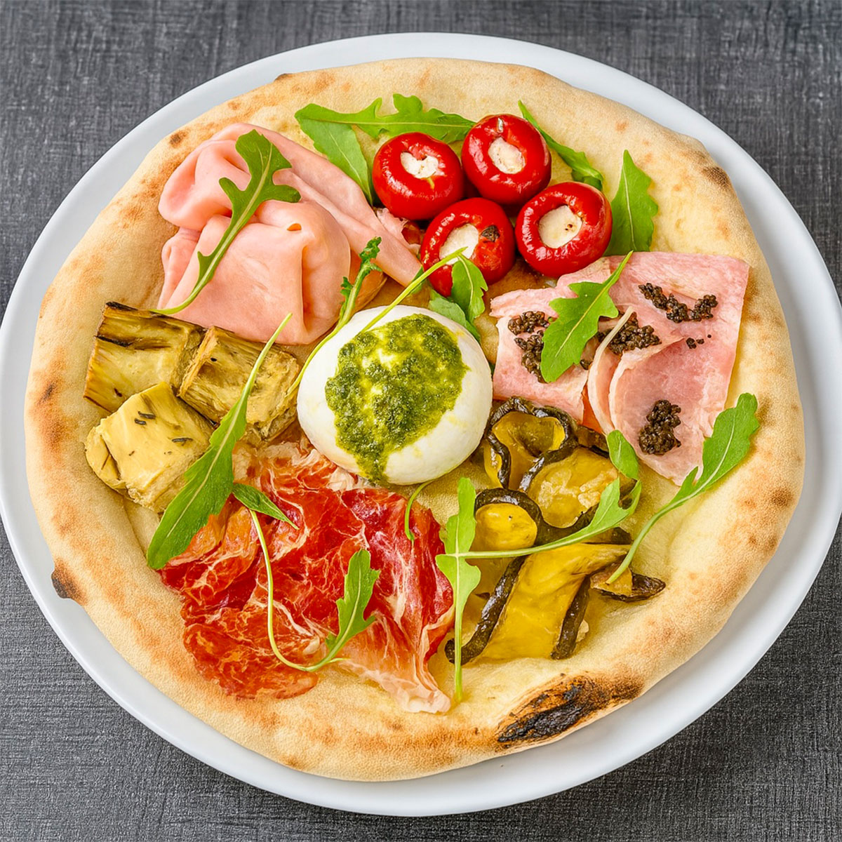Sur Pizzela – Lanières de courgettes, cœurs d’artichauts braisés, poivrons farcis ricotta, 1/2 Burrata crémeuse, jambon Italien, mortadelle IGP, jambon a la truffe.